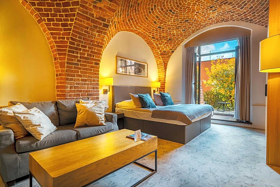 Located in the oldest part of the hotel, with original, 16th-century ceilings and brick elements, as well as a garden access. It has air-conditioning, custom designed furniture, bathrobes, slippers, tea and coffee making facilities and a safe. Guests have access to a free fitness room. The photos presented on the website are for illustrative purposes only, the rooms may differ slightly from each other.